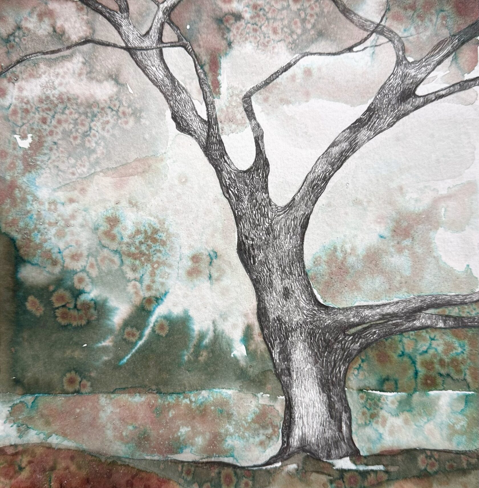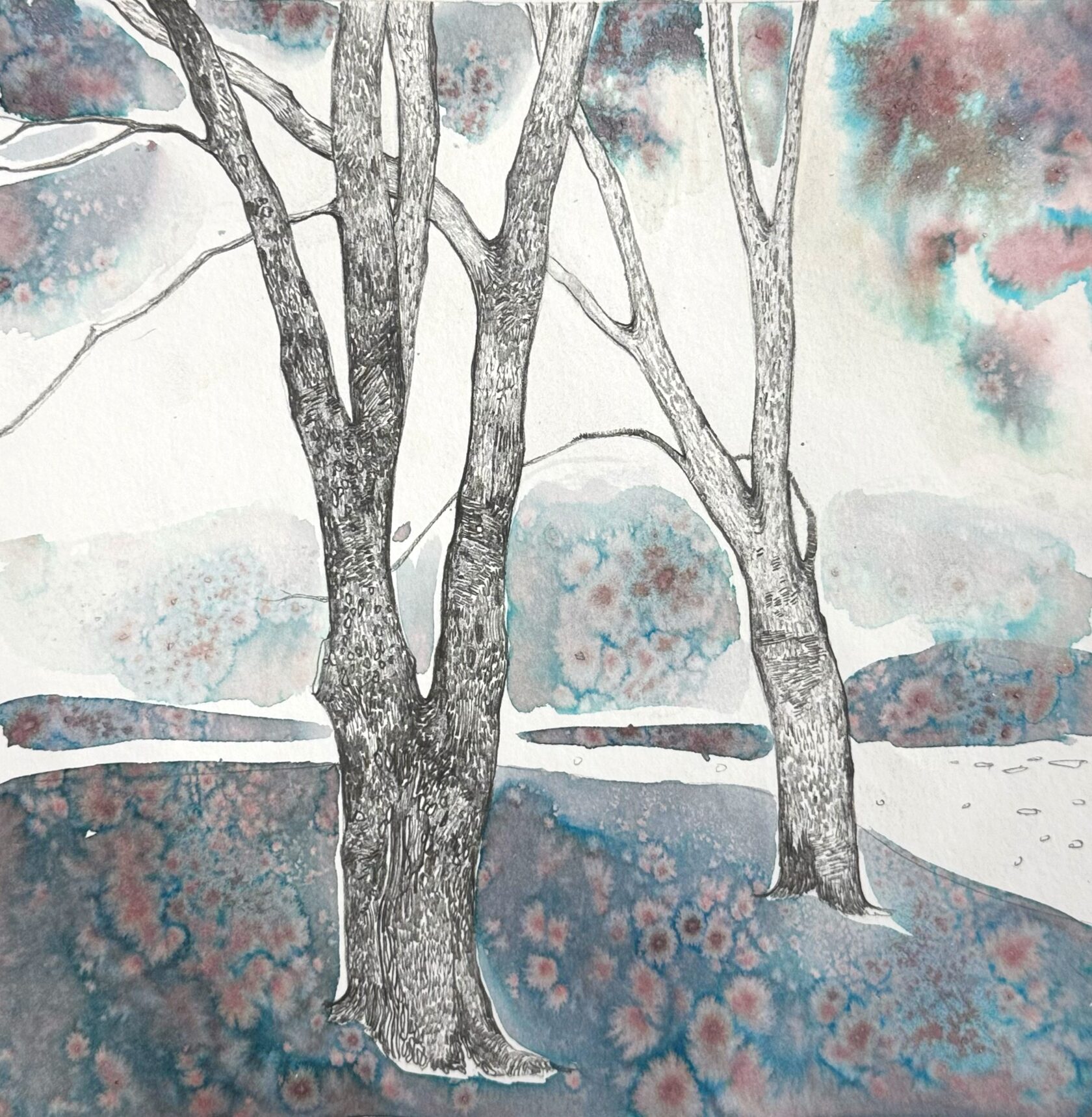 В Перми вокруг Оперного театра расположился Театральный сад. Он находится между моей мастерской и местом, где мне довелось поработать чуть больше года. Проходя через него вновь и вновь, по дороге туда и обратно, я начала замечать, что деревья в этом саду будто бы сами актеры - застыли на радость зрителя в театральных необычных позах. Мне очень нравится изображать текстуру коры - она всегда разная, неповторимая. Сочетание материалов в работах этой серии также привлекает меня - абсолютно предсказуемый карандаш и совершенно непредсказуемые чернила.