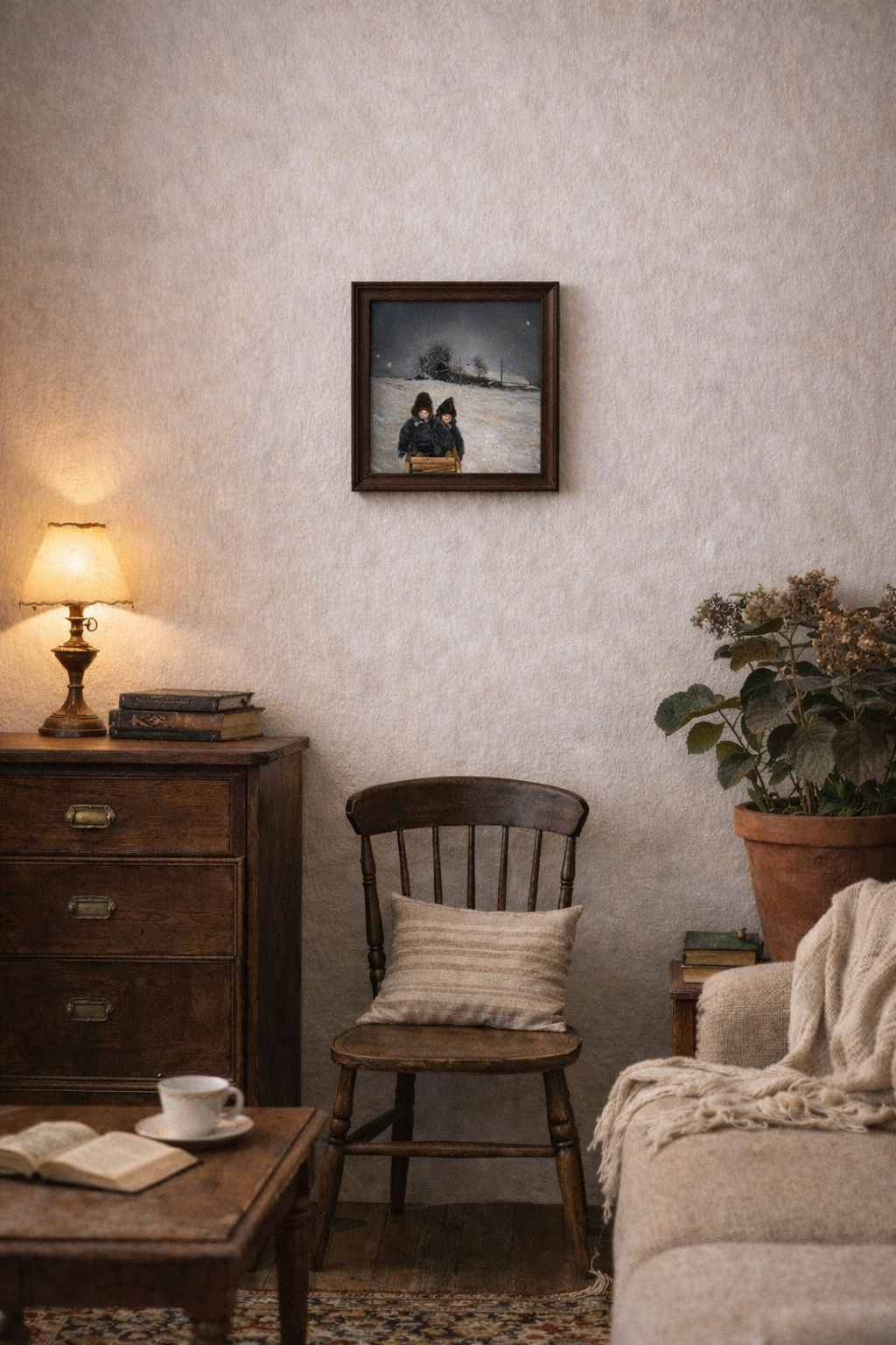 Мы с сестрой Ксеночкой. Мне 2, Ксюше 5. Съехали с горы в кошевёнках - маленьких санях со спинкой. Это деревня Семино недалеко от Ильинского. Здесь находится дом бабушки Любы, которая мастерит кукол, пишет маслом, играет на гитаре, пишет стихи, прозу, и еще готовит всякое из всякого - всегда вкусно. Уже темнеет, и снег пошел к вечеру. Пора возвращаться в дом.
