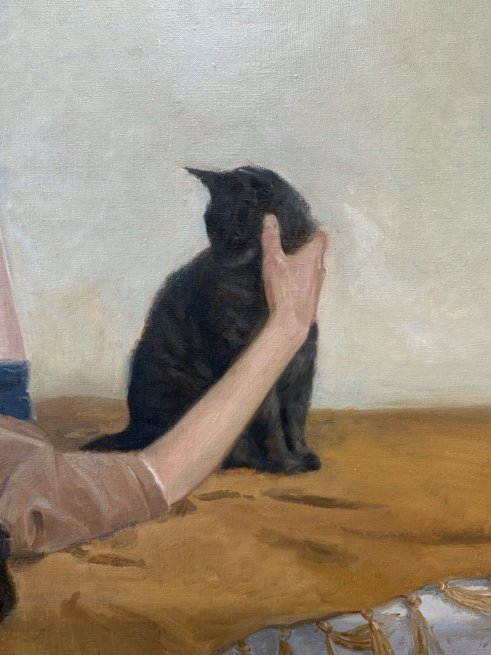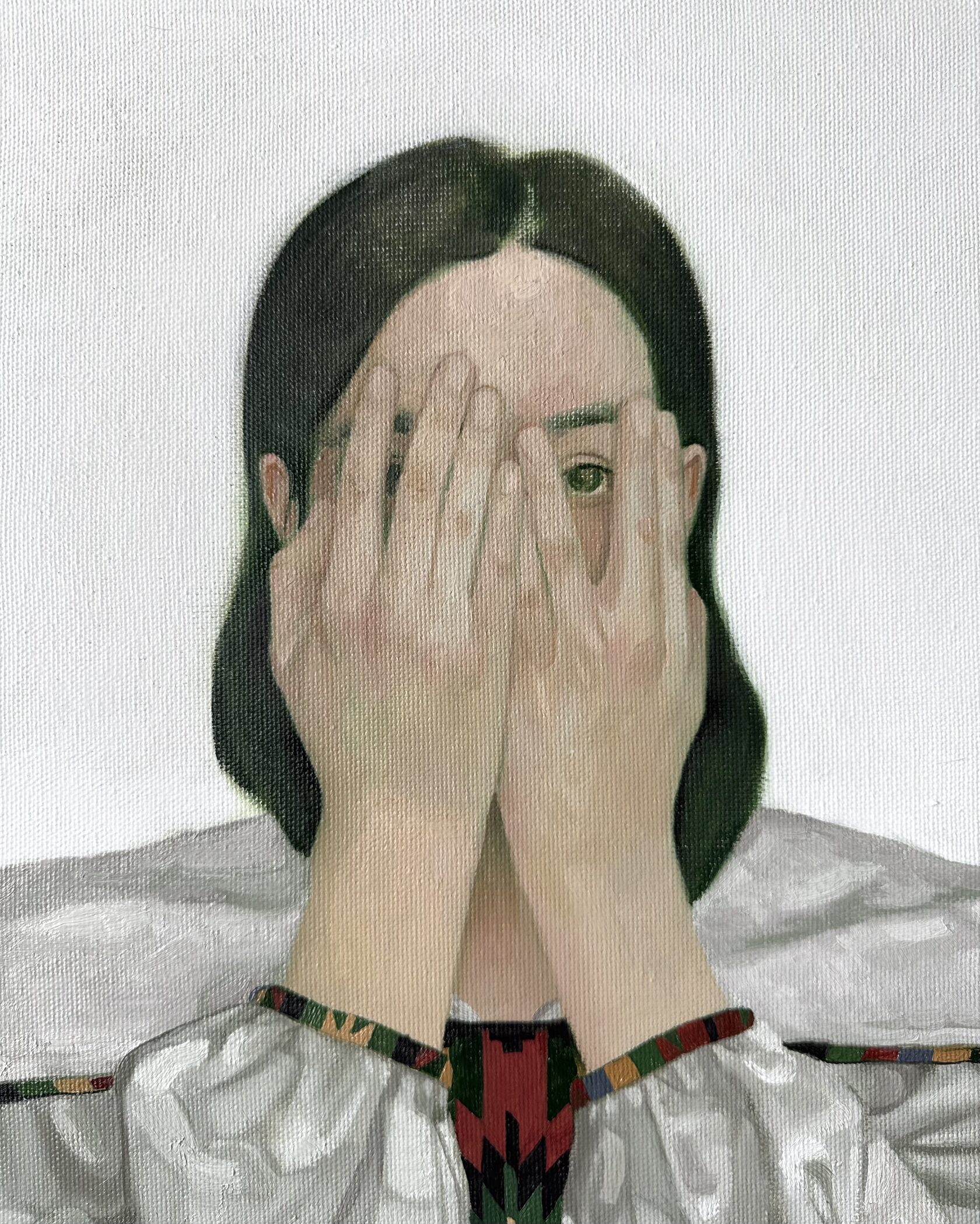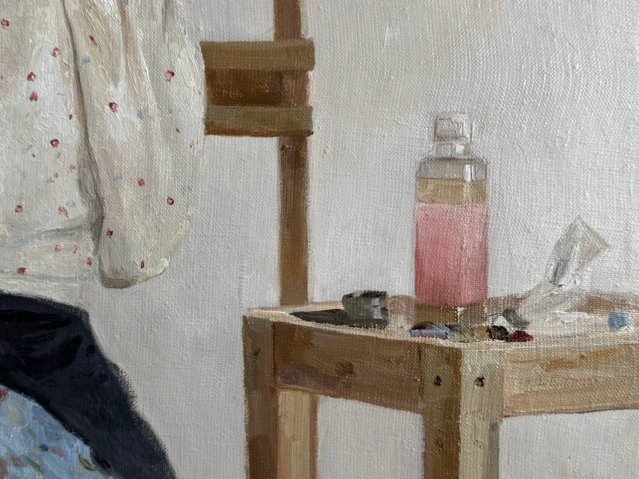Мои волосы начали седеть в 15 лет. Сейчас, спустя 10 лет, серебристых волосков уже довольно много, и с каждым днём всё больше. Моё рабочее место в мастерской находится у зеркала и напротив окна. Часто, когда я сажусь за работу, перед этим кидаю взгляд в зеркало и ужасаюсь - уже вырисовываются целые пряди, и при таком освещении их видно даже если не приглядываться. Что ж, я решила написать автопортрет, в котором моя голова будет полностью седой, и, может быть, меня перестанет пугать такое стремительное старение. Посмотрим. Забавный факт - насмотрелась на себя седую, пока писала, потом глянула в зеркало - и уже непривычно. И вроде не такая уже и седая.