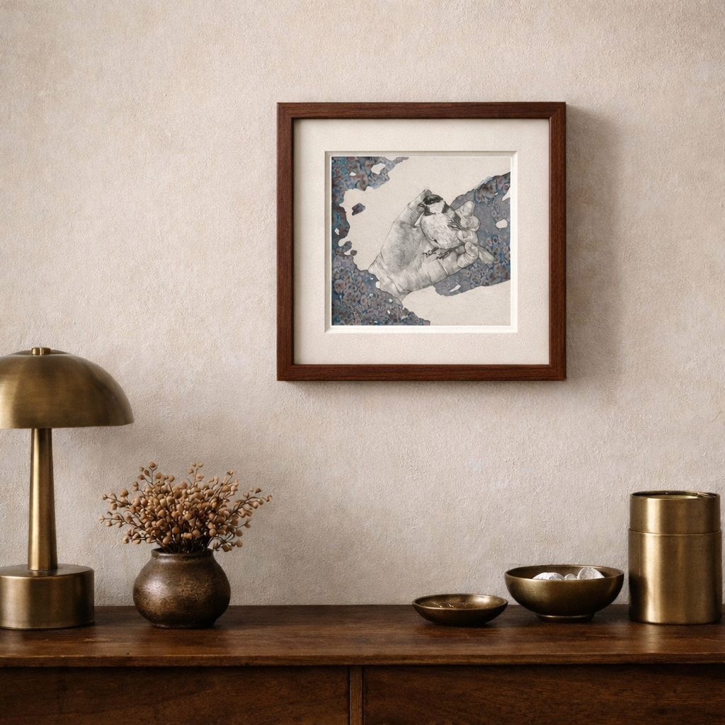 Бумага/карандаш/чернила, 10х10, 20х20 по паспарту, деревянная рама, стекло. 2025