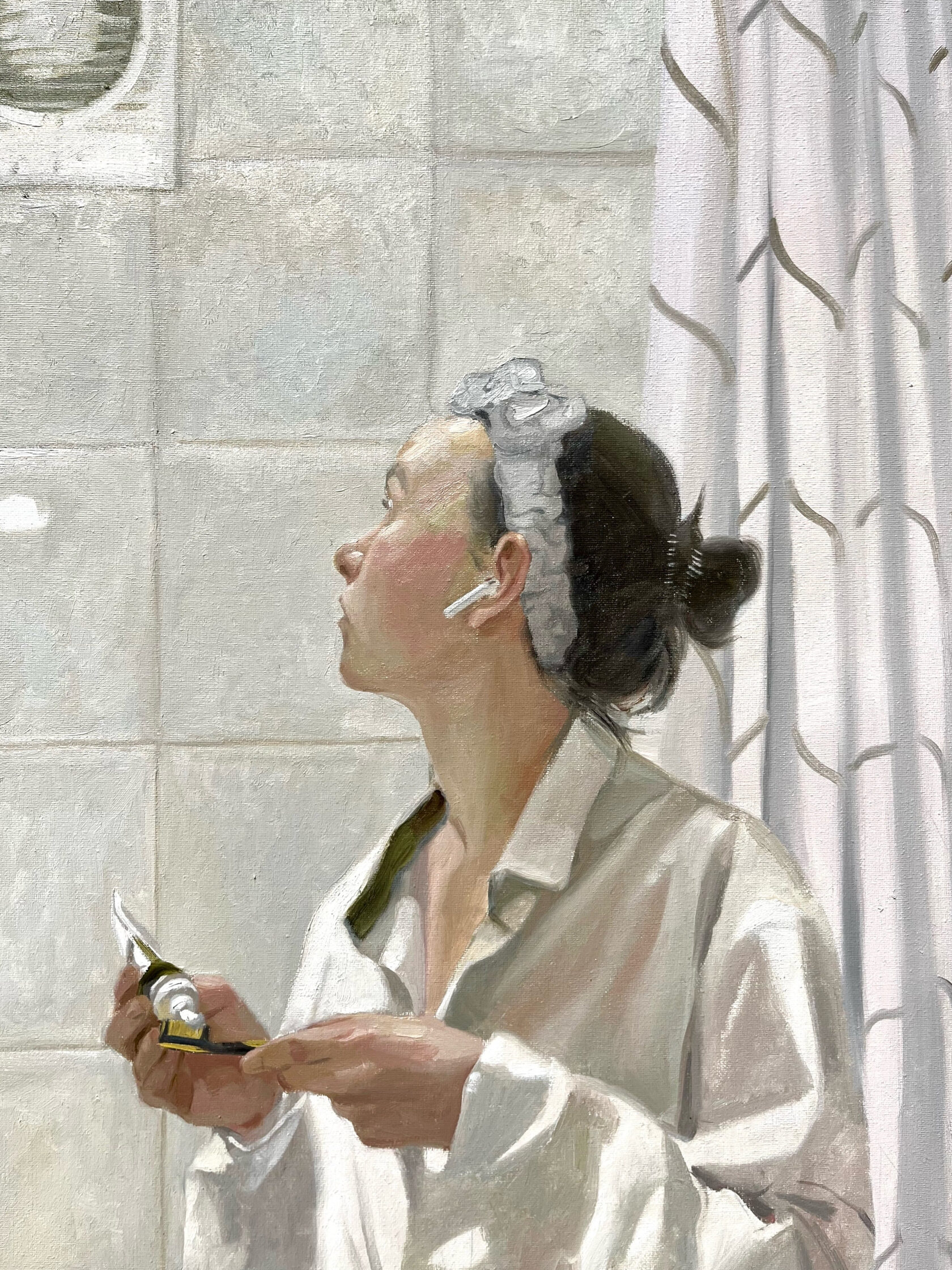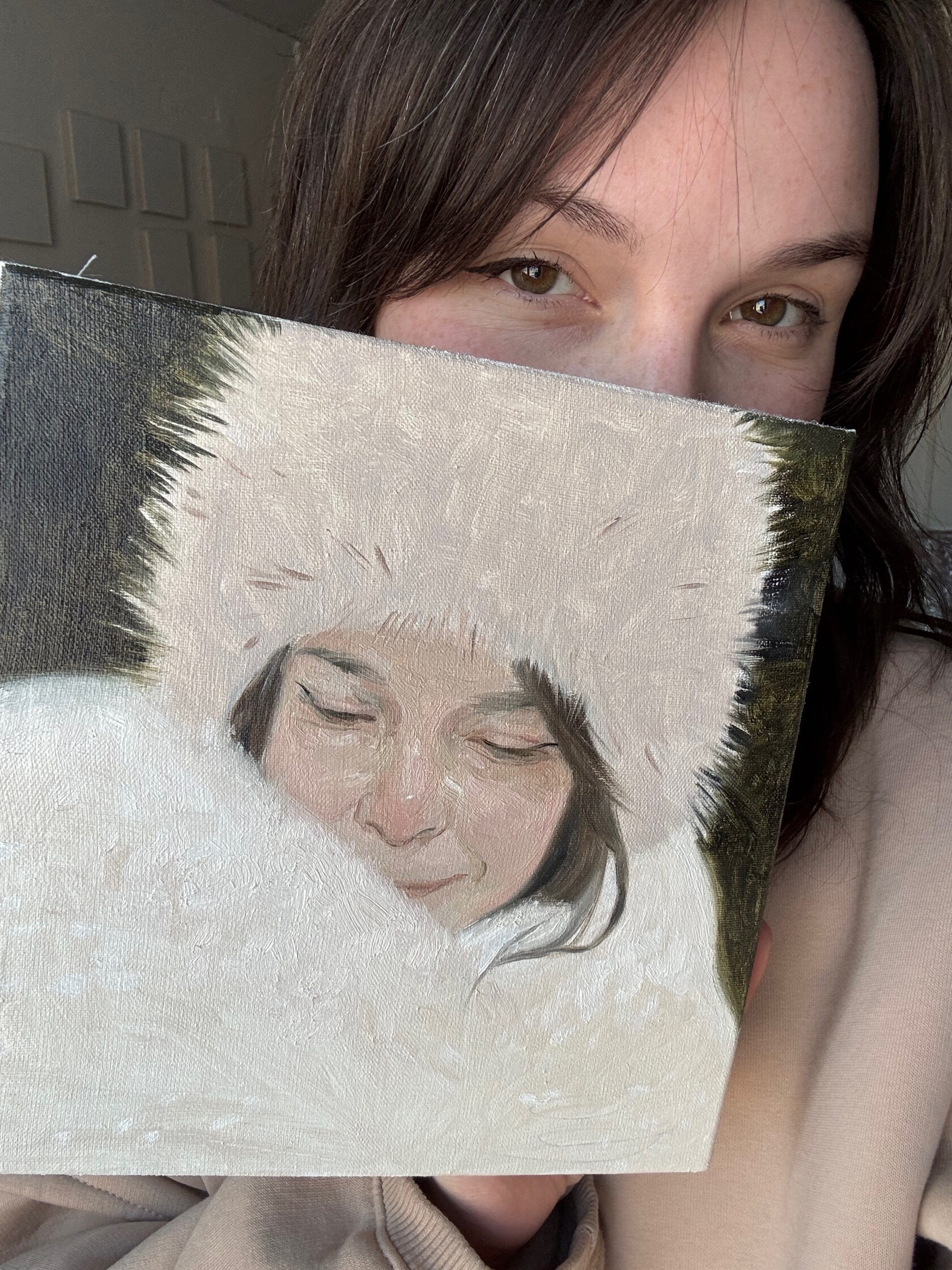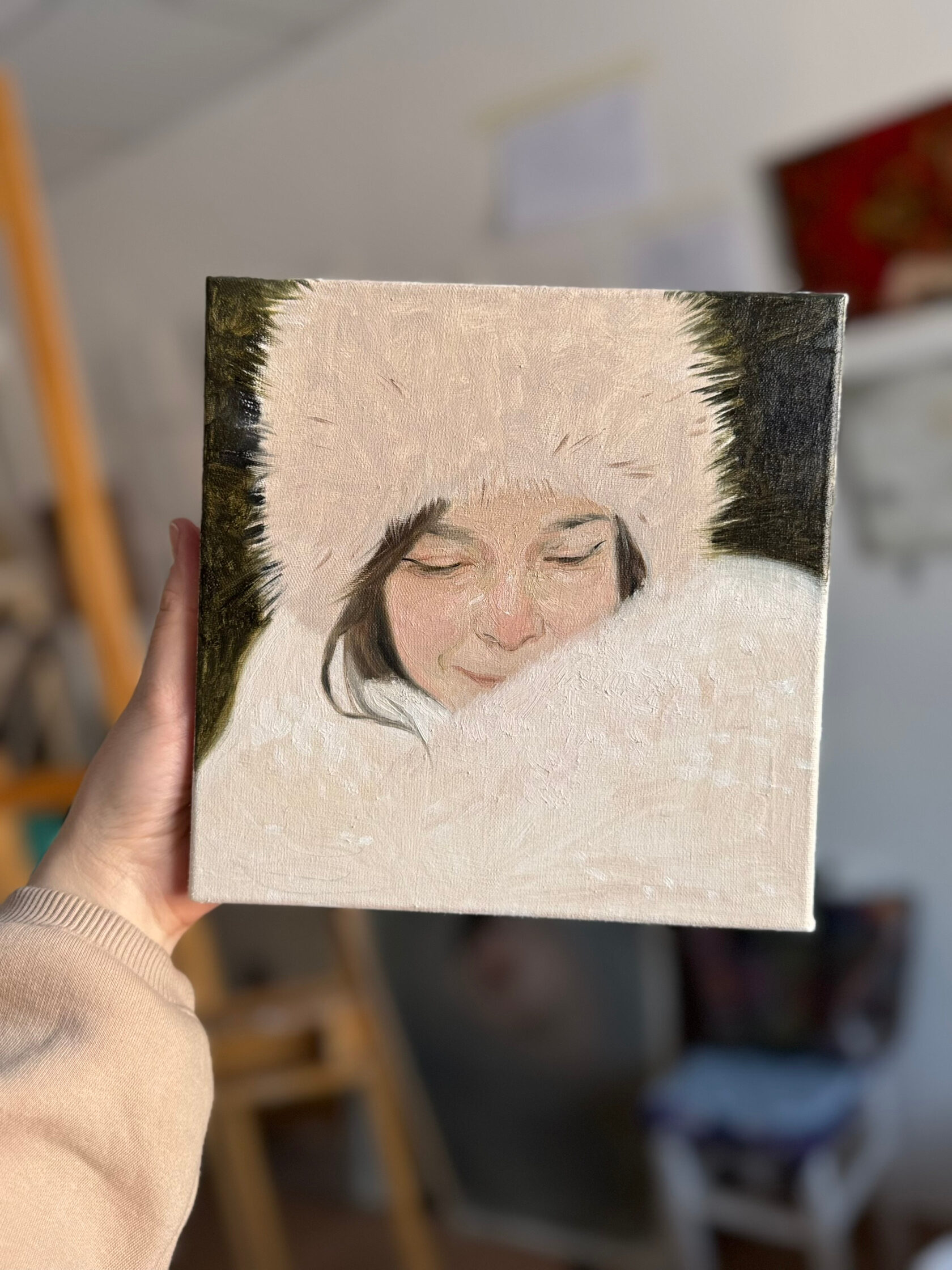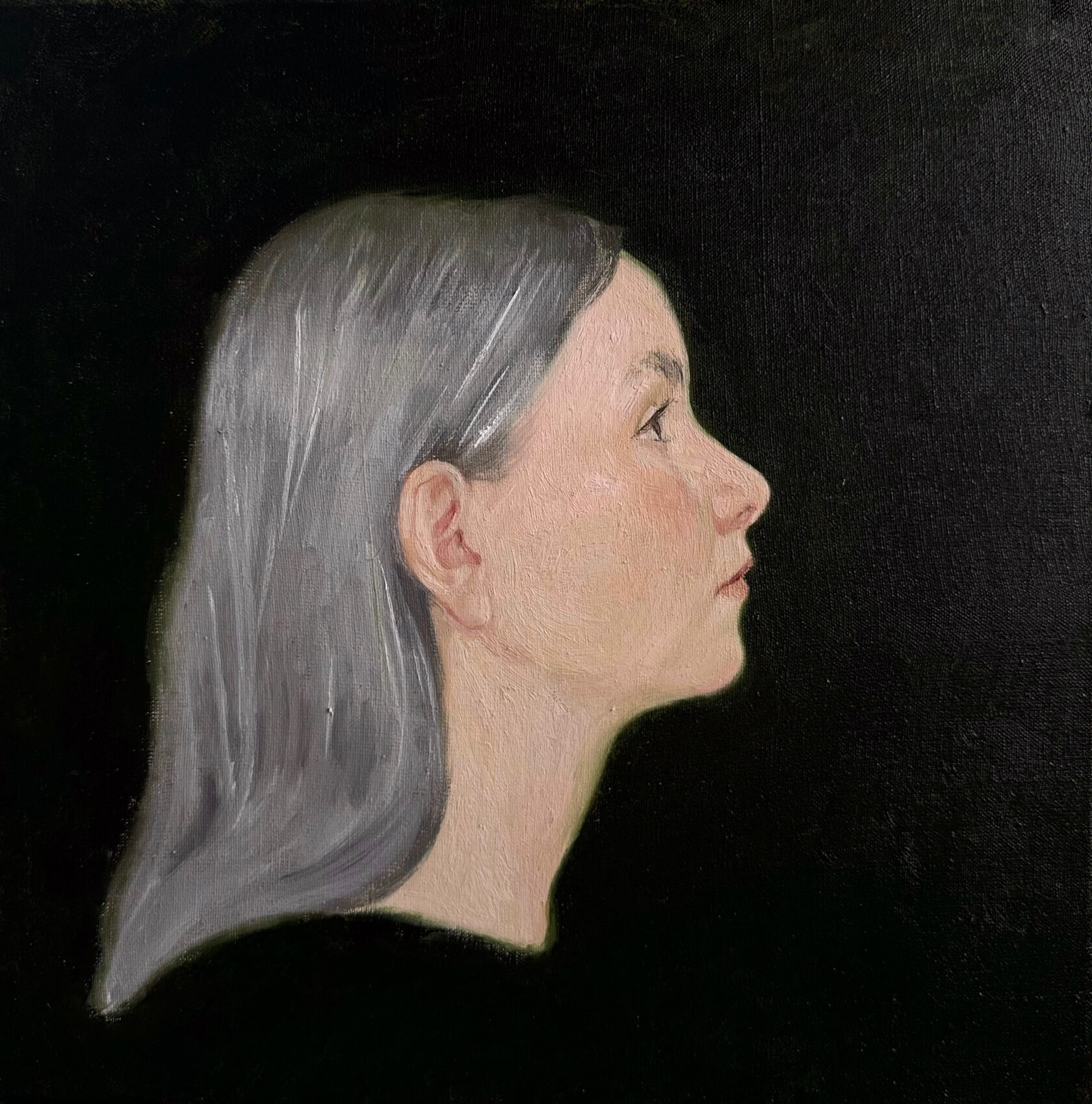 Мои волосы начали седеть в 15 лет. Сейчас, спустя 10 лет, серебристых волосков уже довольно много, и с каждым днём всё больше. Моё рабочее место в мастерской находится у зеркала и напротив окна. Часто, когда я сажусь за работу, перед этим кидаю взгляд в зеркало и ужасаюсь - уже вырисовываются целые пряди, и при таком освещении их видно даже если не приглядываться. Что ж, я решила написать автопортрет, в котором моя голова будет полностью седой, и, может быть, меня перестанет пугать такое стремительное старение. Посмотрим. Забавный факт - насмотрелась на себя седую, пока писала, потом глянула в зеркало - и уже непривычно. И вроде не такая уже и седая.