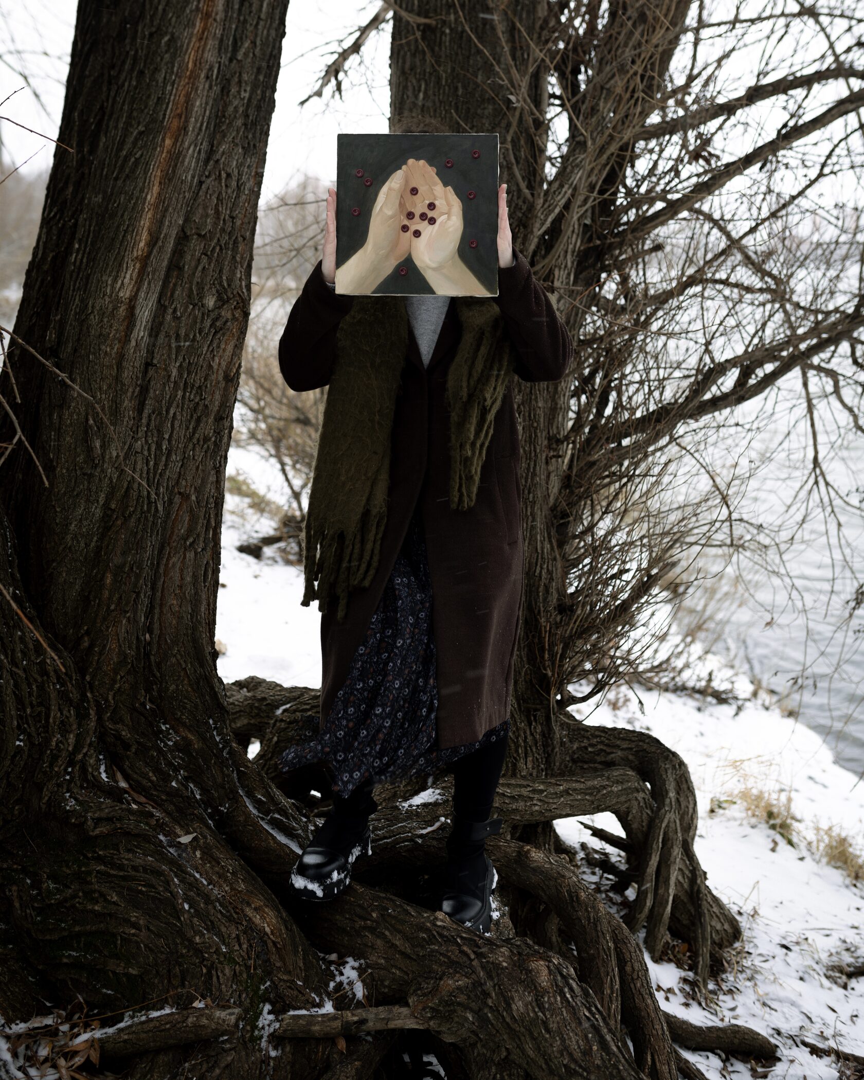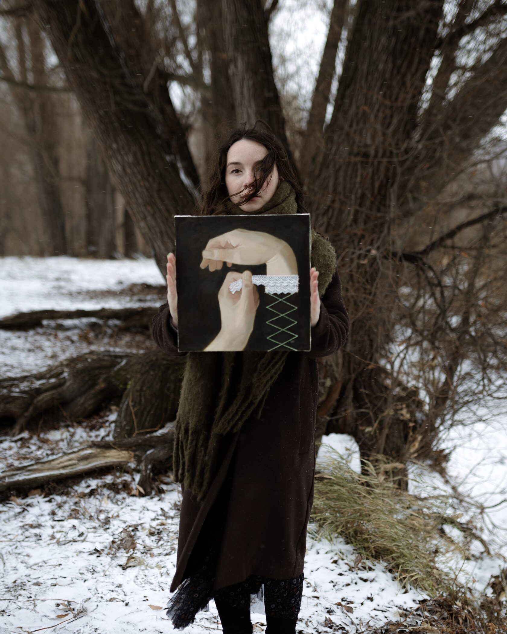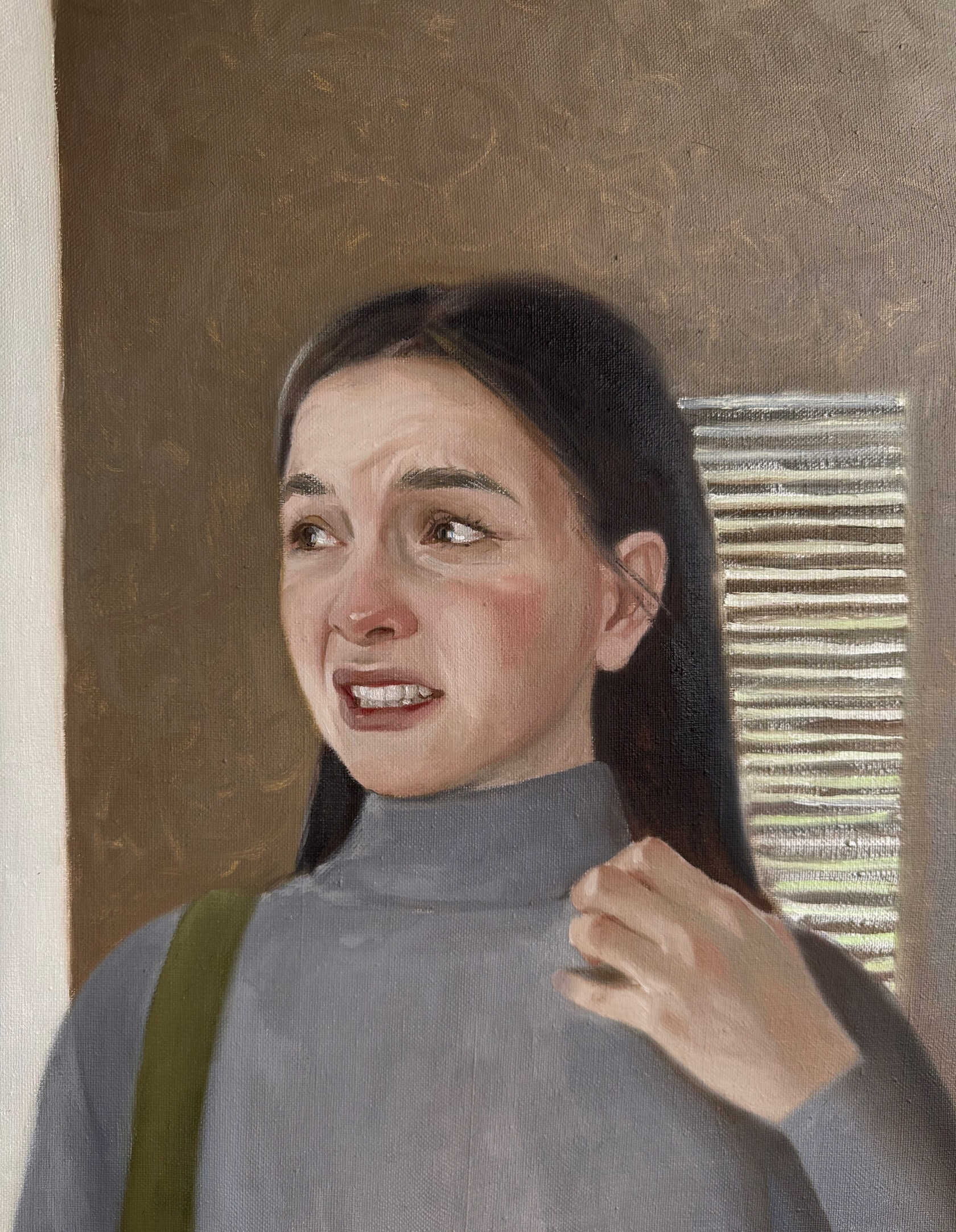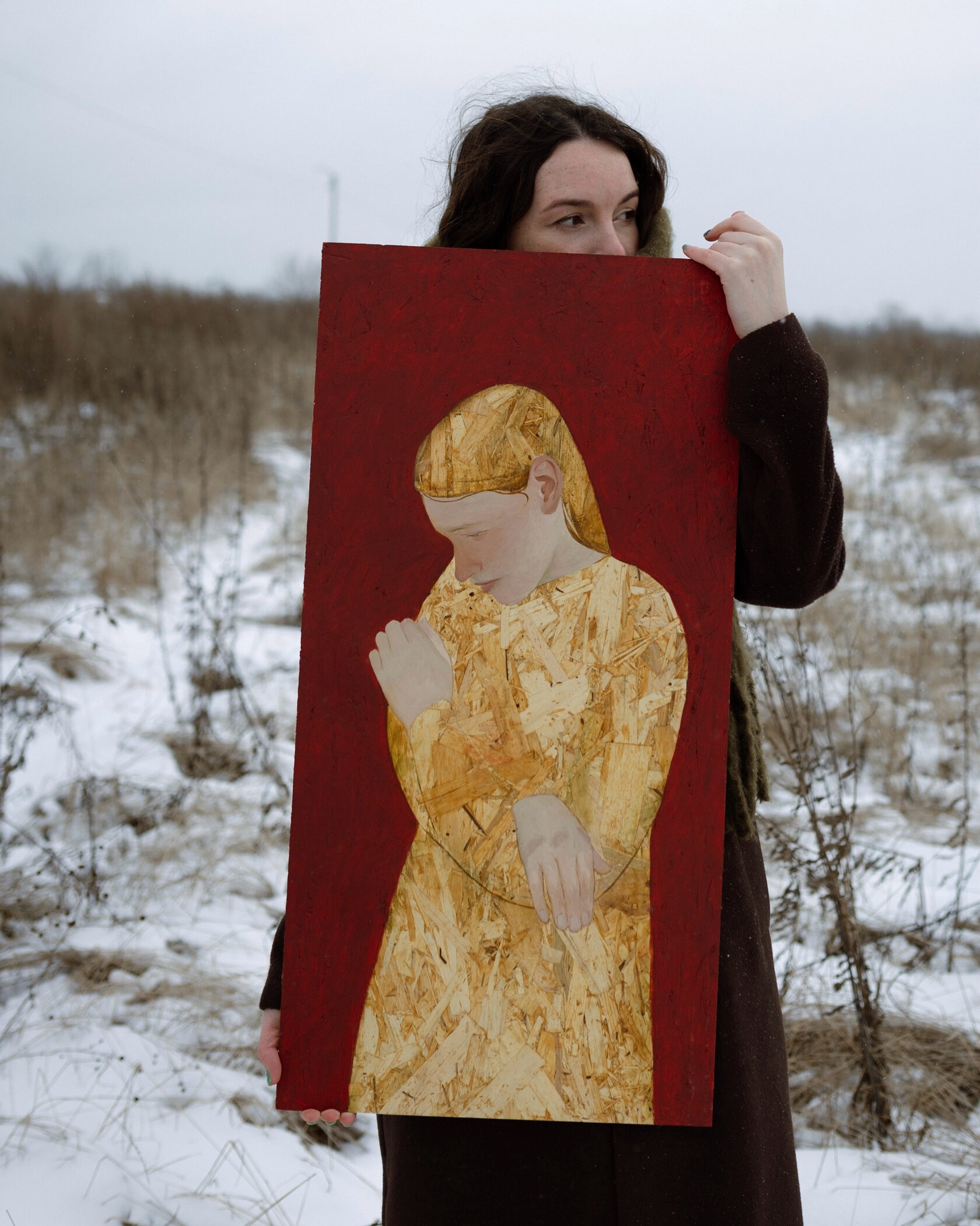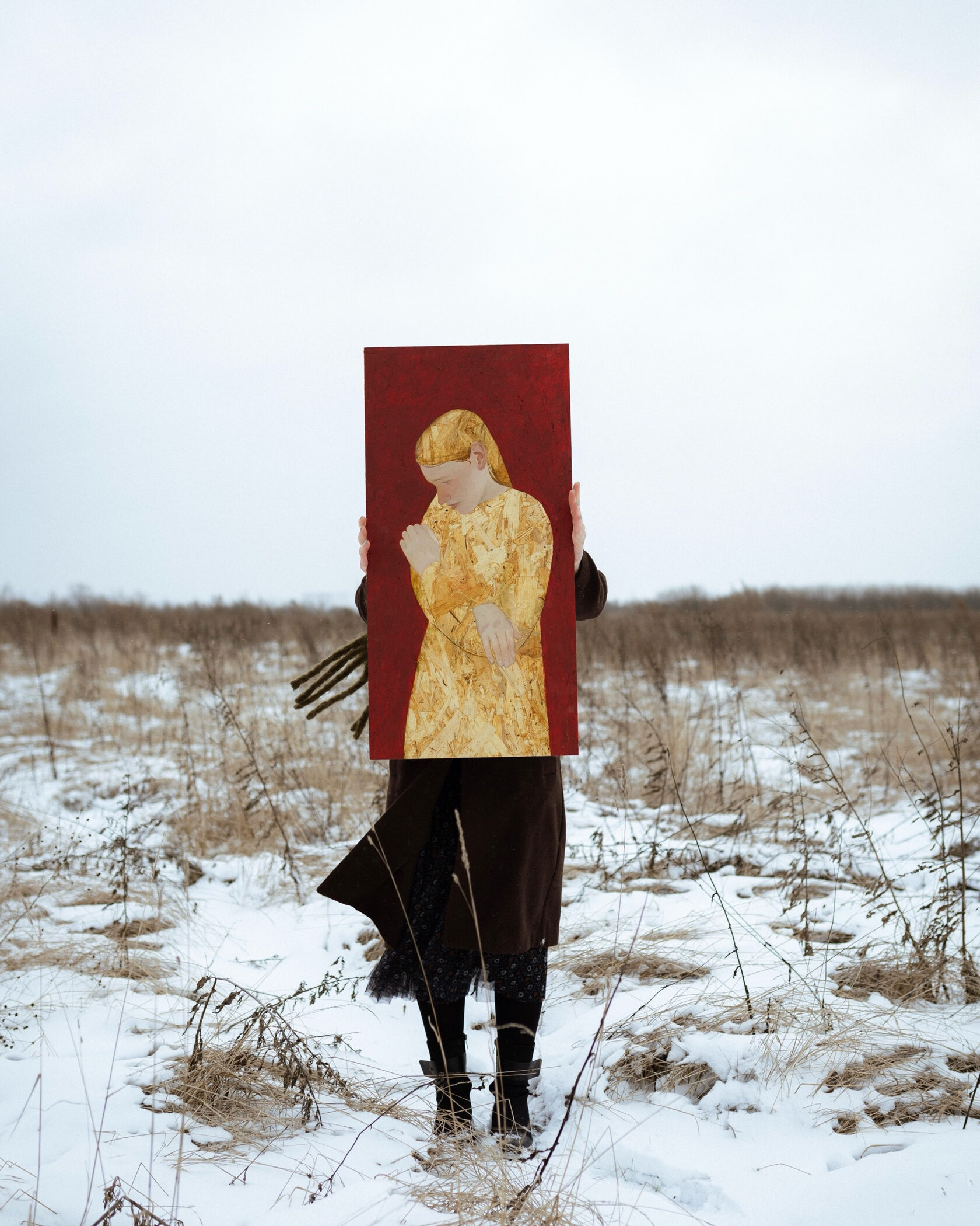 Мои волосы начали седеть в 15 лет. Сейчас, спустя 10 лет, серебристых волосков уже довольно много, и с каждым днём всё больше. Моё рабочее место в мастерской находится у зеркала и напротив окна. Часто, когда я сажусь за работу, перед этим кидаю взгляд в зеркало и ужасаюсь - уже вырисовываются целые пряди, и при таком освещении их видно даже если не приглядываться. Что ж, я решила написать автопортрет, в котором моя голова будет полностью седой, и, может быть, меня перестанет пугать такое стремительное старение. Посмотрим. Забавный факт - насмотрелась на себя седую, пока писала, потом глянула в зеркало - и уже непривычно. И вроде не такая уже и седая.