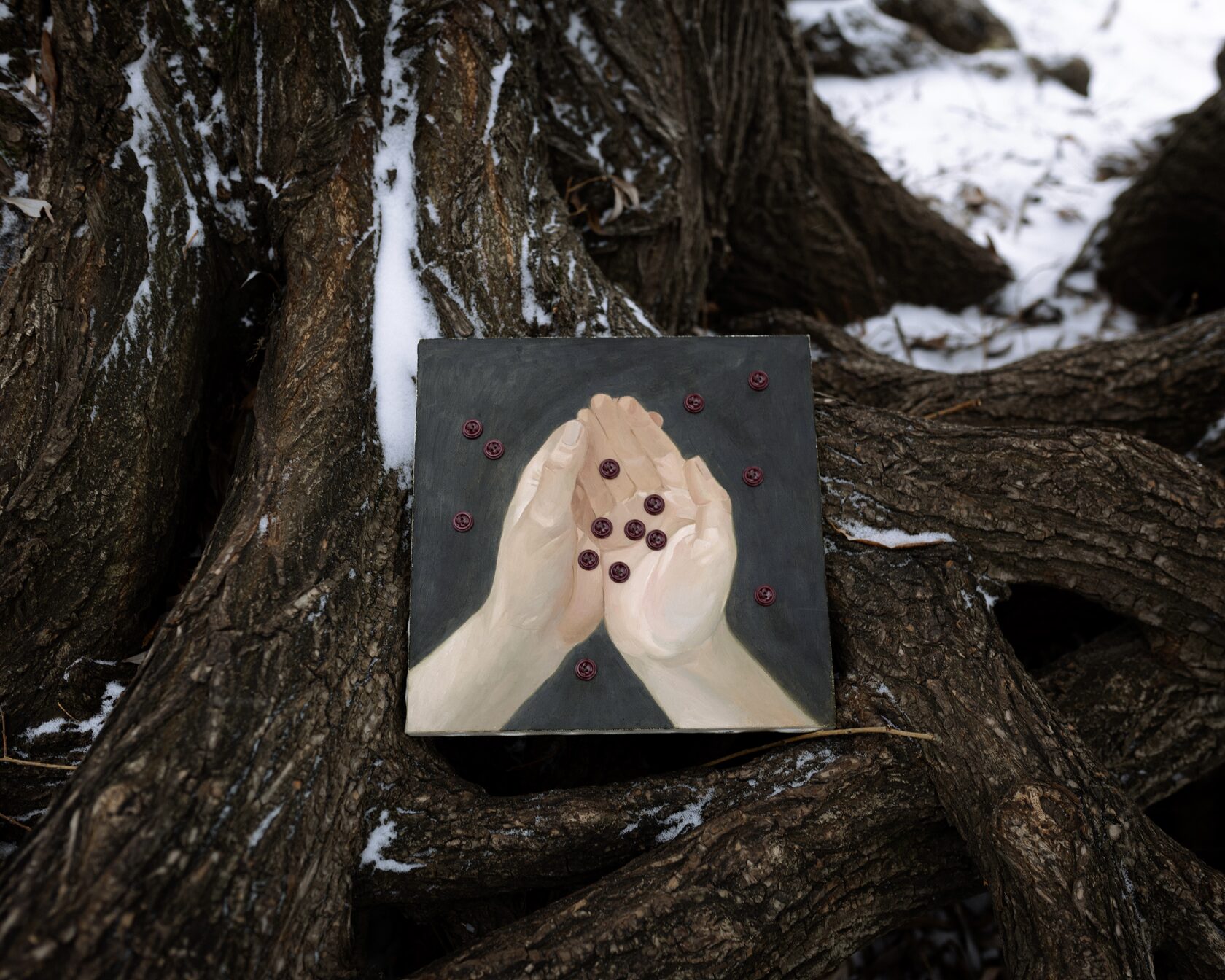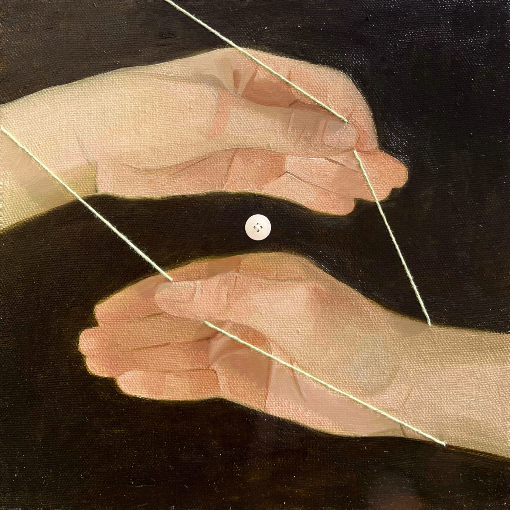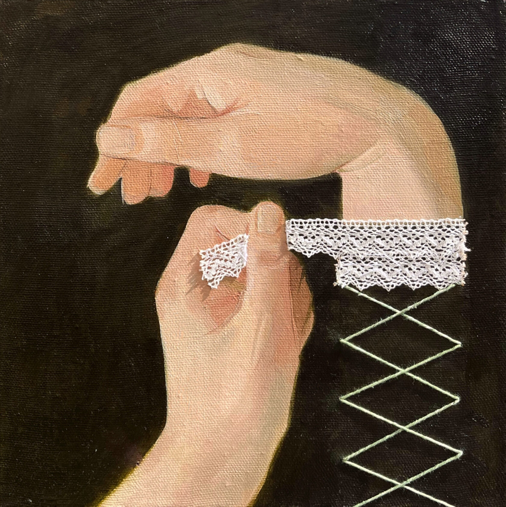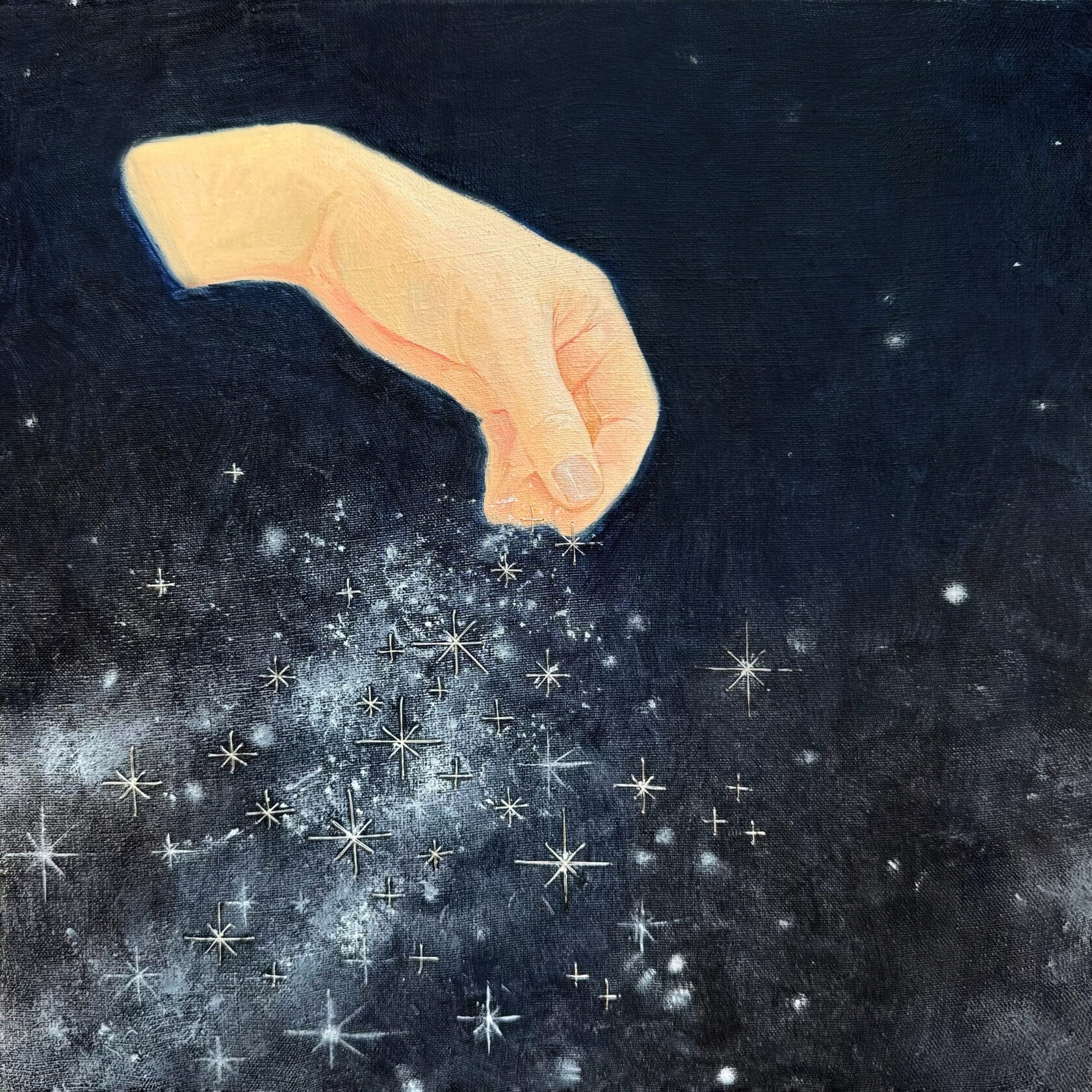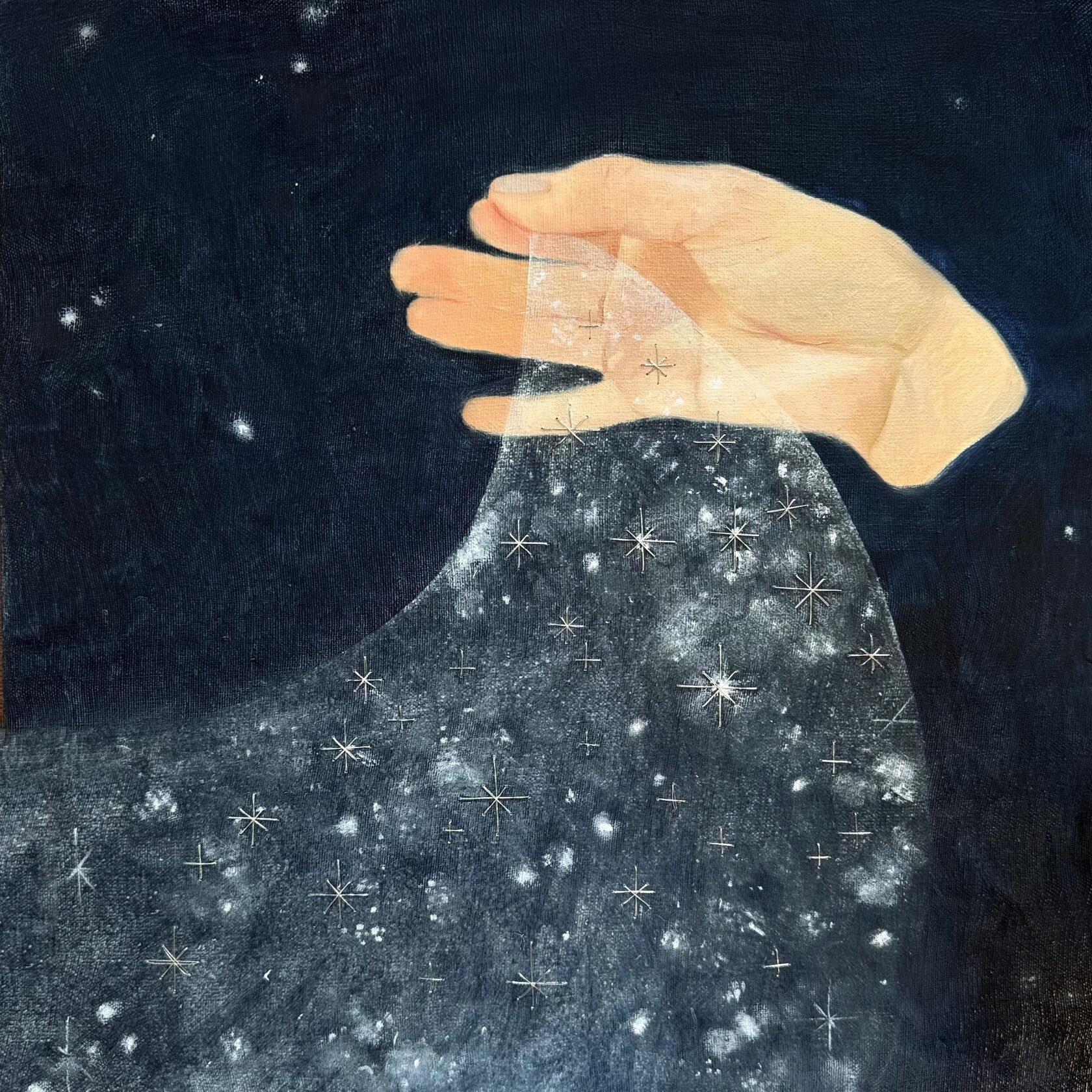Левая часть диптиха "Откуда на небе берутся звезды" Холст/масло, вышивка, 30х30, 2025