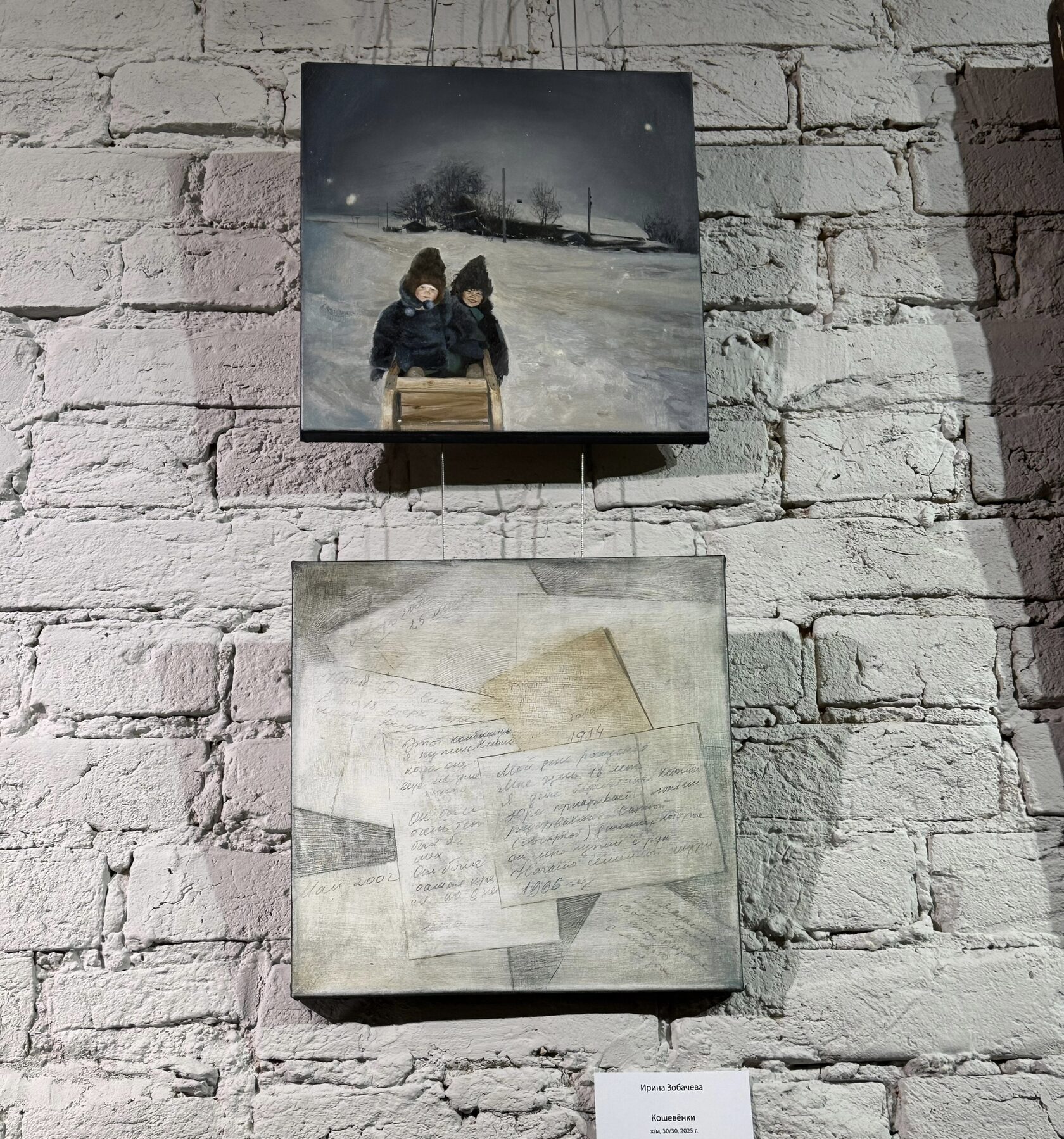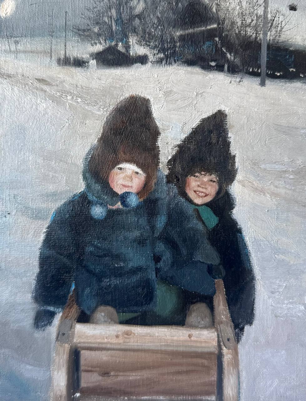 Мы с сестрой Ксеночкой. Мне 2, Ксюше 5. Съехали с горы в кошевёнках - маленьких санях со спинкой. Это деревня Семино недалеко от Ильинского. Здесь находится дом бабушки Любы, которая мастерит кукол, пишет маслом, играет на гитаре, пишет стихи, прозу, и еще готовит всякое из всякого - всегда вкусно. Уже темнеет, и снег пошел к вечеру. Пора возвращаться в дом.